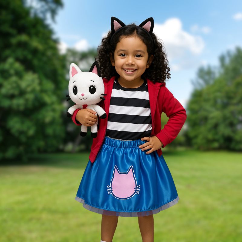 👉 Incluye todo lo necesario: blusa en franela suave, falda en satín brillante, chaleco en algodón perchado y balaca de orejitas.